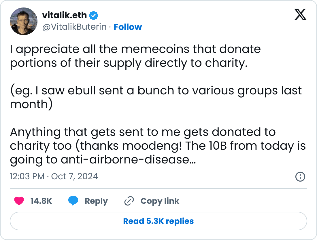 Oct 28: Proceeds from Vitalik’s $MOODENG sales (400 ETH) were donated to Ukrainian humanitarian organizations.