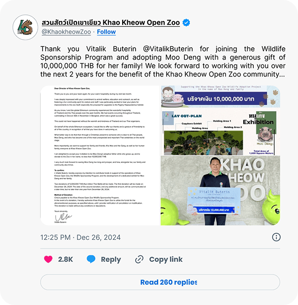 September 24 to 26, 2024, volunteers representing the $MOODENG ETH CTO community visited the home of the baby hippo, MooDeng, and donated 37,588.2 THB (Thai Baht) to the zoo.